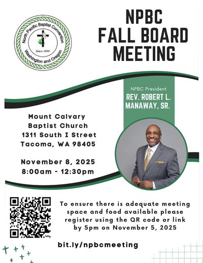 We are meeting in-person at Mount Calvary Baptist Church in Tacoma on Saturday, November 8, for our annual fall board meeting! The session will begin at 8 a.m. with a continental breakfast, followed by the General Session and Board/Auxiliary meetings at 9am.